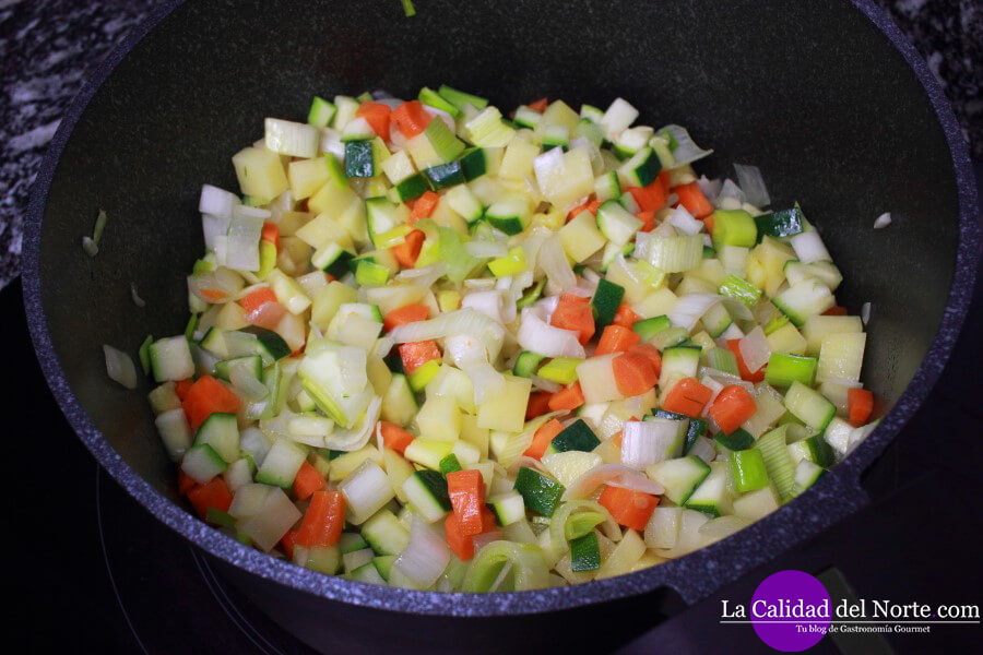 Pasado ese tiempo, añadimos dos zanahorias que habremos cortado en cubos pequeños. También en cubos cortamos y añadimos a la olla un puerro entero, un calabacín y una patata grande.