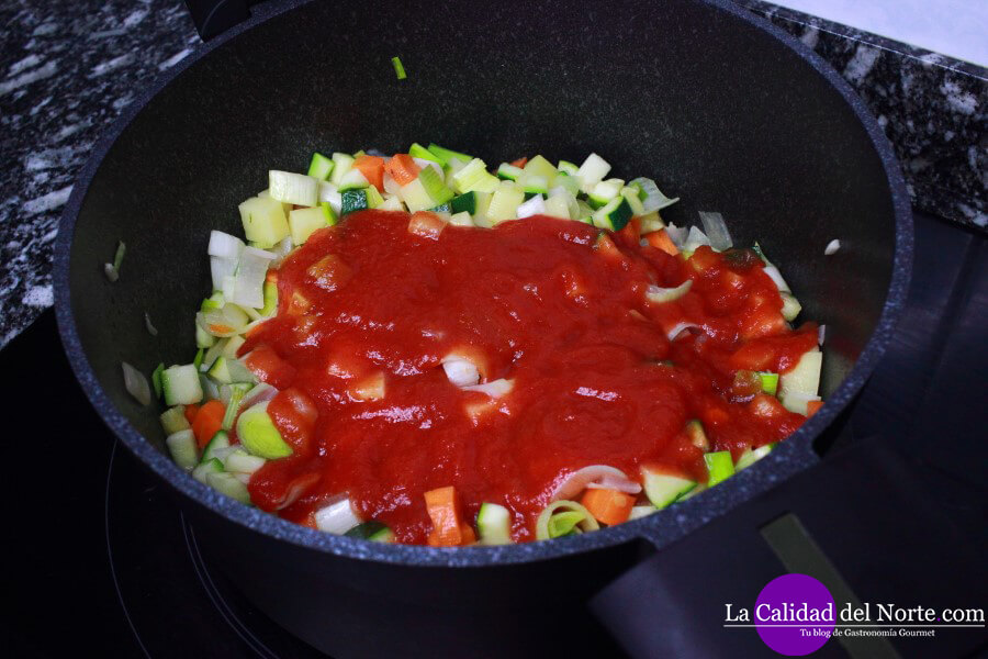 Añadimos a la olla una lata de tomate triturado, unos 390 gramos. Si lo preferís, podéis triturar 2 ó 3 tomates naturales.