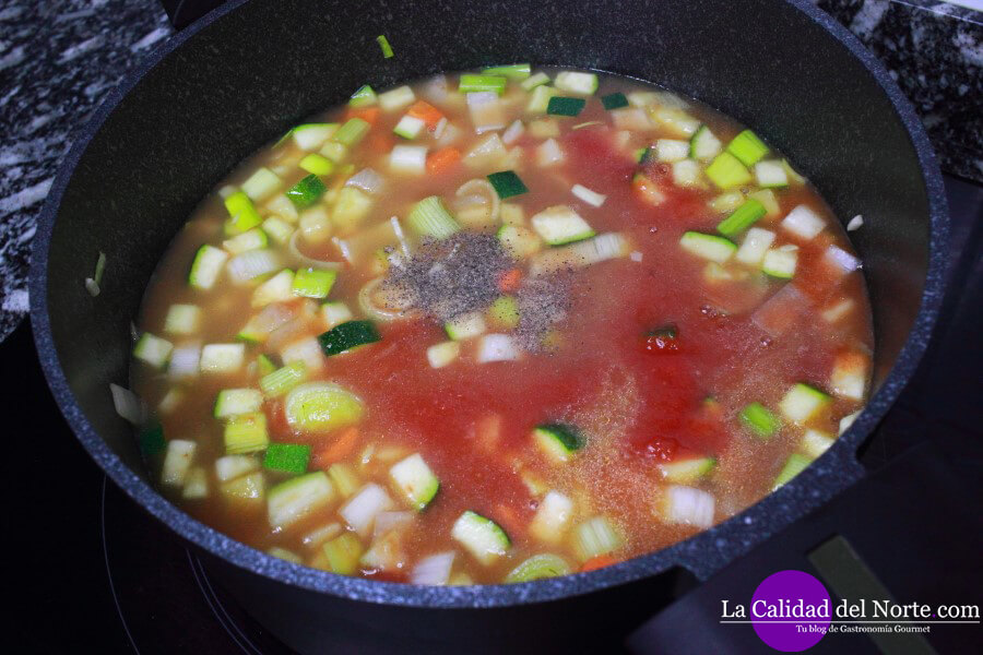 También vertemos un litro y medio de caldo de verduras. Añadimos una buena pizca de sal y espolvoreamos un poco de pimienta negra molida. Esto según tu gusto.