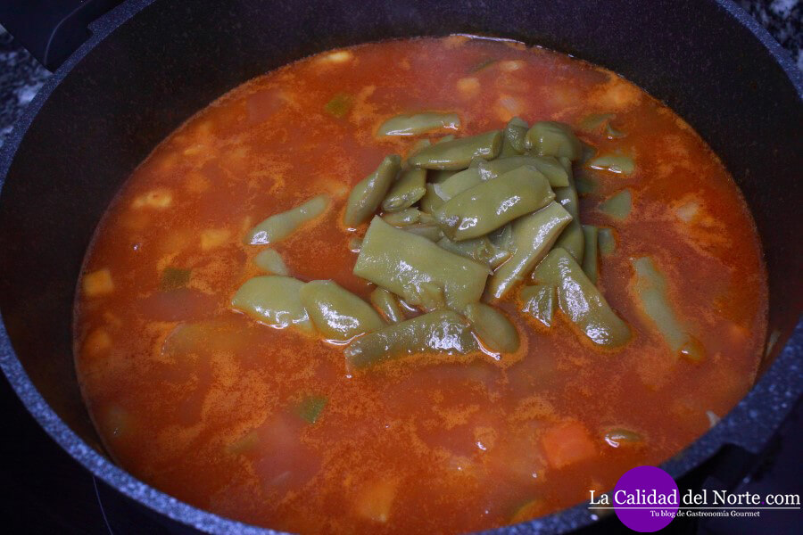 Pasado el tiempo, añadimos un frasco de judías verdes, unos 350 gramos y unos 95 gramos de guisantes en conserva o congelados.