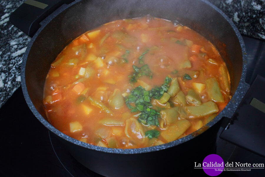Cuando esté la pasta, comprobamos el punto de sal, apagamos el fuego y añadimos unas hojas de albahaca fresca picada. Le dará un toque fantástico a la sopa.