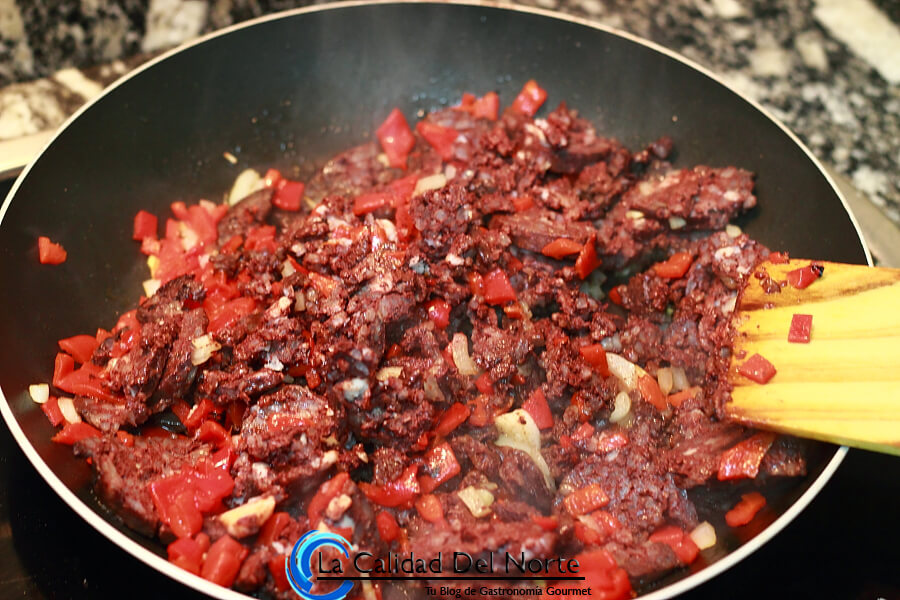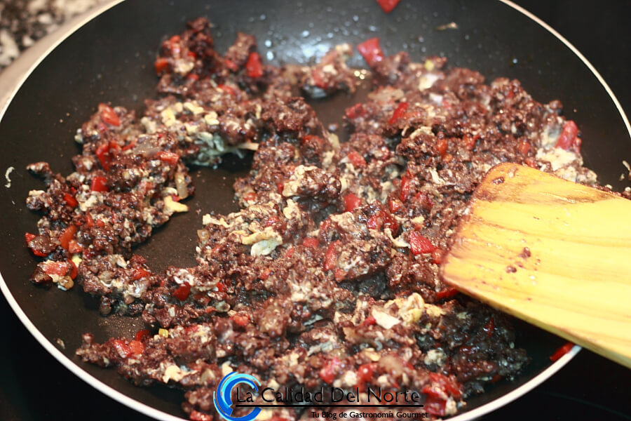 Una vez tengamos la morcilla lista, echamos un huevo encima y removemos para hacer una especie de revuelto. Reservamos.